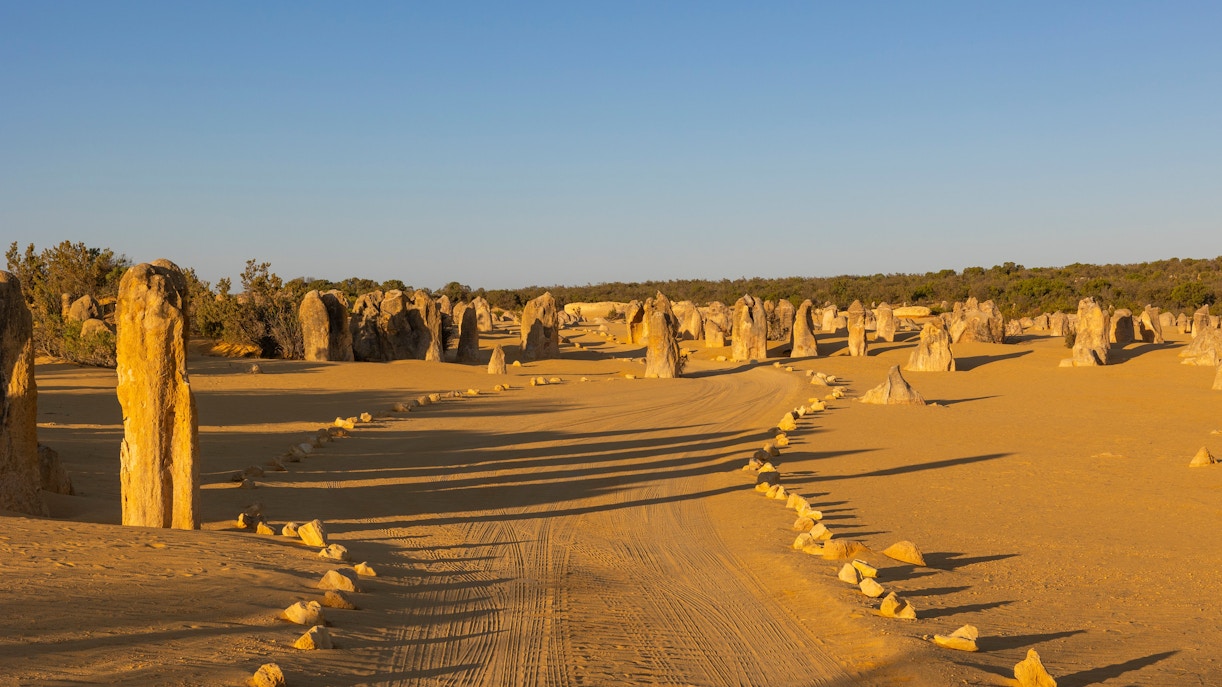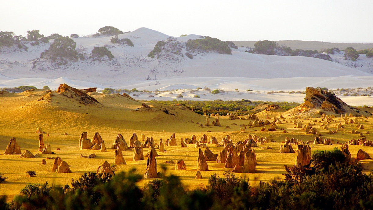 Nambung National Park is famous for the Pinnacles Desert, featuring thousands of limestone spires set against golden sand, creating a unique and photogenic landscape.